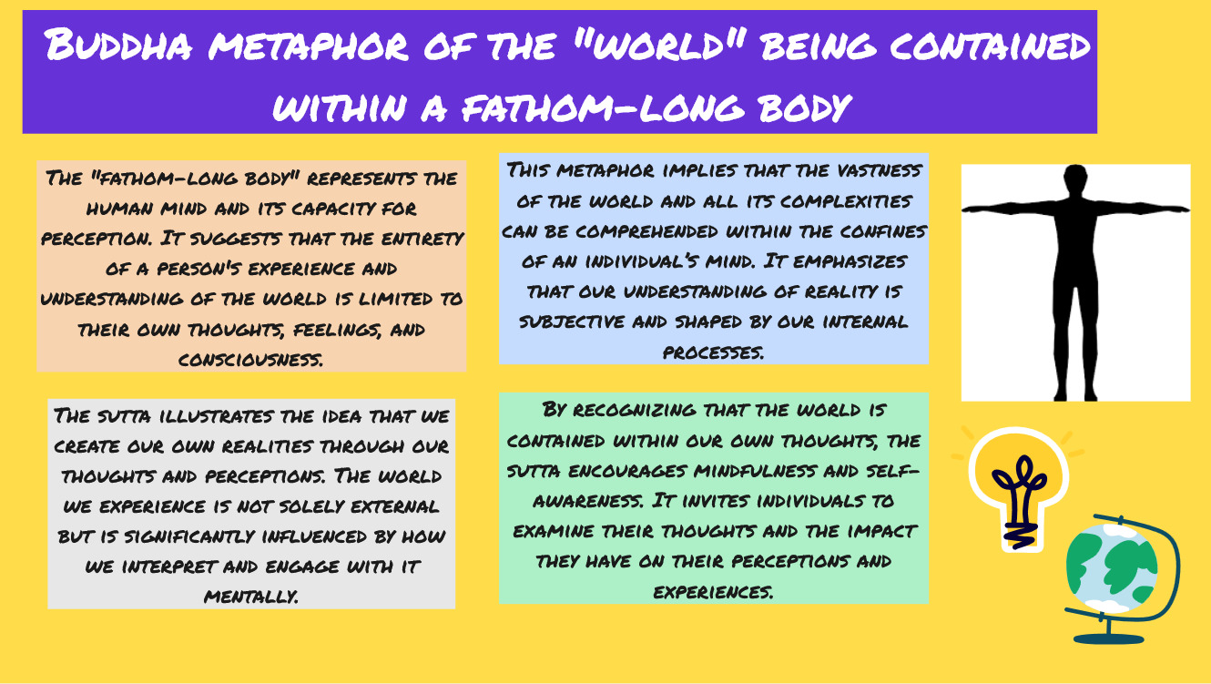 The metaphor of the "world" being encapsulated in a fathom-long body serves to highlight the central role of the mind in shaping our reality. It encourages individuals to cultivate awareness and understanding of their thoughts, thereby transforming their experience of the world. This teaching aligns with the broader Buddhist principles of mindfulness, perception, and the nature of reality.