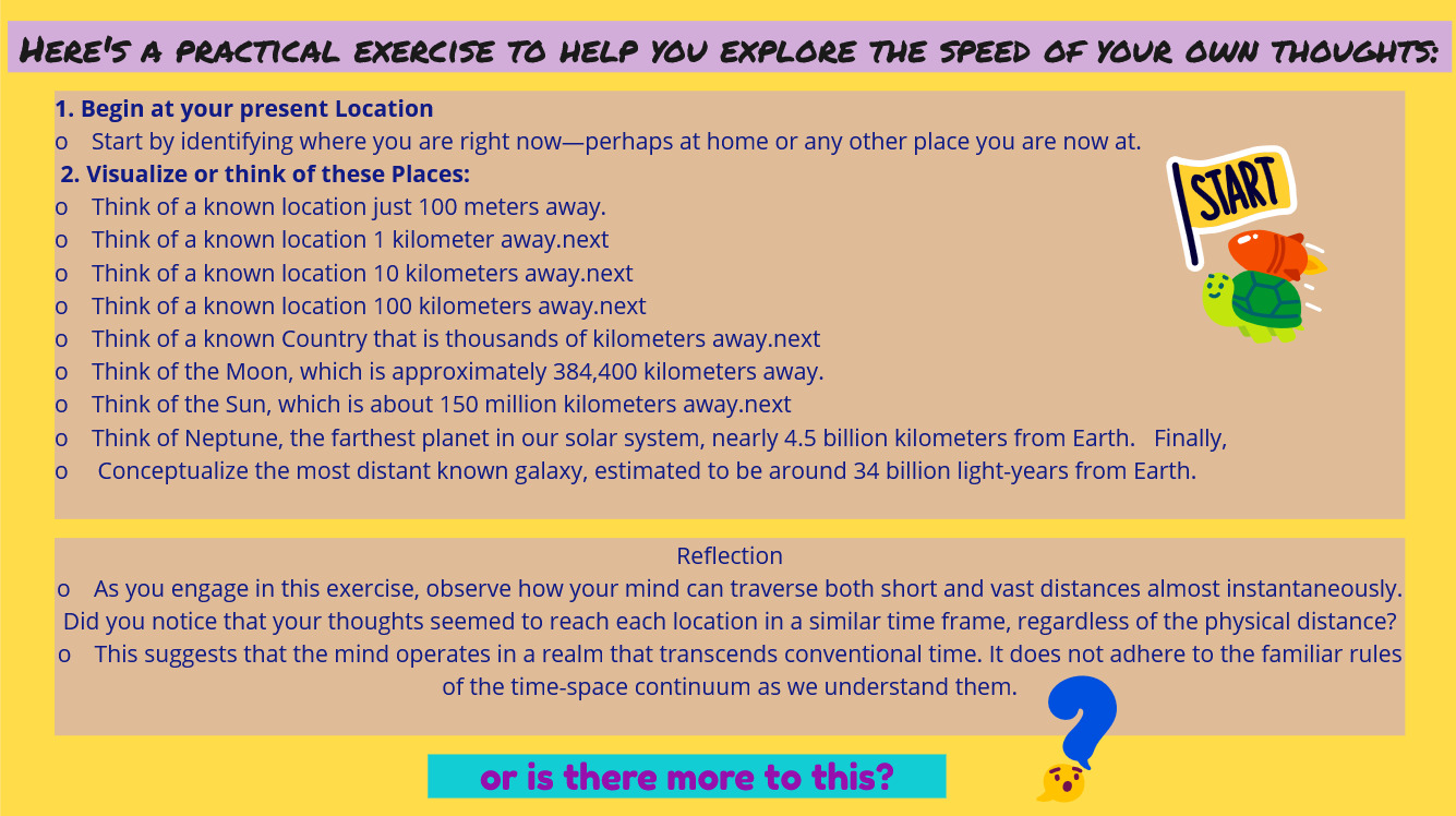 mind thought speed. As you engage in this exercise, observe how your mind can traverse both short and vast distances almost instantaneously. Here's a practical exercise to help you explore the speed of your own thoughts: