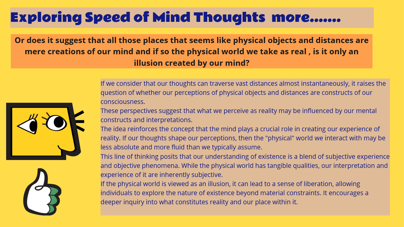 If we consider that our thoughts can traverse vast distances almost instantaneously, it raises the question of whether our perceptions of physical objects and distances are constructs of our consciousness. This aligns with philosophical viewpoints that argue reality is shaped by our perceptions.